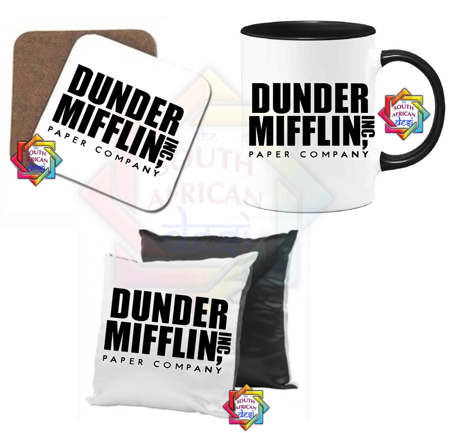 Medium: 1 x Two-Tone Mug + 1 x Wooden Coaster (10cmX10cm) + 1 x Cushion (25cmX25cm) @ R250